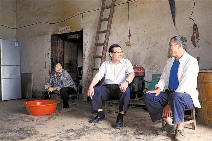 七月八日至十二日,省委书记胡和平深入安康市紫阳县城关镇双坪村驻村蹲点,开展“不忘初心、牢记使命”主题教育专题调研。图为他在村民朱高海家中详细了解其生活状况。记者 宋红梅摄